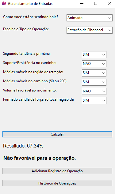 Em poucas palavras, o Algotrading utiliza um sistema baseado em perguntas e respostas, onde cada escolha tem um peso que afeta diretamente o resultado final da análise. Este sistema simples, mas poderoso, ajuda você a avaliar se determinada operação é favorável ou não para entrar no mercado, proporcionando maior segurança e assertividade nas suas decisões.