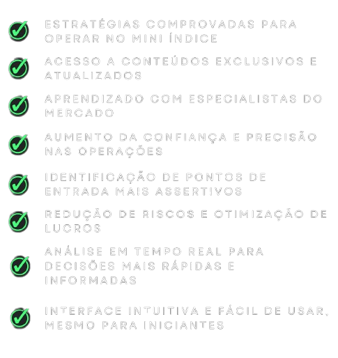 Com o nosso Treinamento Completo para operar no Mini Índice, você aprenderá as melhores estratégias do mercado. Além disso, nossa ferramenta exclusiva de Algoritmo de Trading fornecerá dados e insights em tempo real para otimizar suas operações, aumentando as chances de lucro e diminuindo significativamente os riscos.